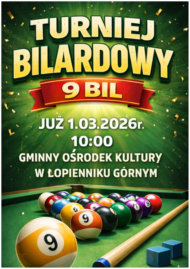 2026-02-25 | Brak komentarzy Zapraszamy wszystkich miłośników bilarda na turniej 9-Bil!Przed nami sportowa rywalizacja, świetna atmosfera i walka o zwycięstwo do ostatniej bili! 📅 Data: 1.03.2026 r.📍 Miejsce: Gminny Ośrodek Kultury w Łopienniku Górnym🕒 Start: 10:00