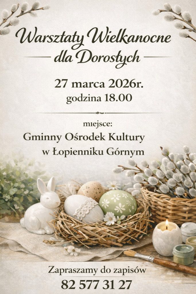 2026-03-16 | Brak komentarzy 🐰 Warsztaty WielkanocneZapraszamy na wspólne tworzenie świątecznych dekoracji. 📅 27 marca 2026 r.🕒 18.00📍 Gminny Ośrodek Kultury w Łopienniku Górnym Liczba miejsc ograniczona – zapisz się już dziś! 82-577-31-27 Do zobaczenia! 🌷🥚